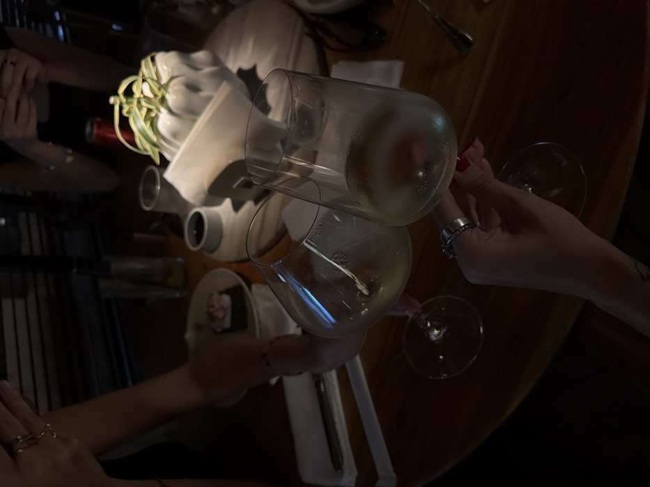 The image depicts an indoor dining scene in Tibubeneng, Indonesia, characterized by dim lighting. In the foreground, two clear stemless wine glasses, containing a light-colored liquid and showing condensation, are clinking together in a toast. A hand with red fingernail polish and a silver-toned ring on the ring finger holds the glass on the right, with a faint tattoo visible on the forearm. To the left, another hand is partially visible, holding the second glass. The objects rest on a polished wooden table. Various dining items are arranged on the table: a small white rectangular plate holds a single serving of food, possibly sushi or an appetizer, topped with a pink substance. Adjacent to it is a small white bowl containing a dark liquid, presumably a sauce. A white ceramic decorative item, resembling a stylized skull or head, functions as a planter holding a small green plant. A red beverage can is also visible. Portions of other diners, indicated by hands and arms, are present in the mid-ground and background, which remains dark and indistinct.