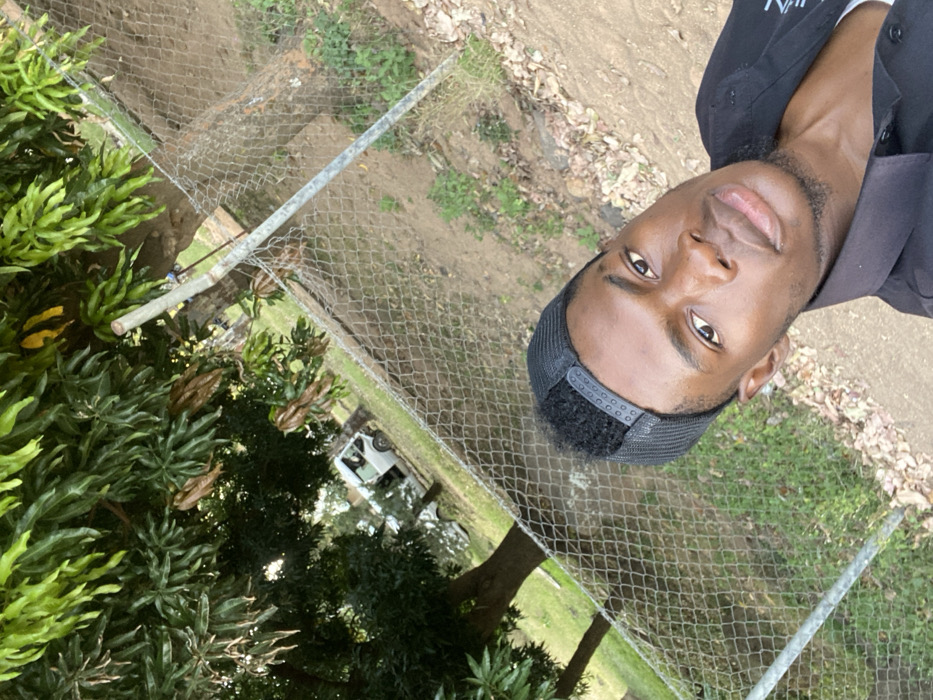 A close-up selfie depicts a young adult male of dark complexion, wearing a black backward mesh baseball cap and a black collared shirt, gazing directly at the camera with a neutral expression