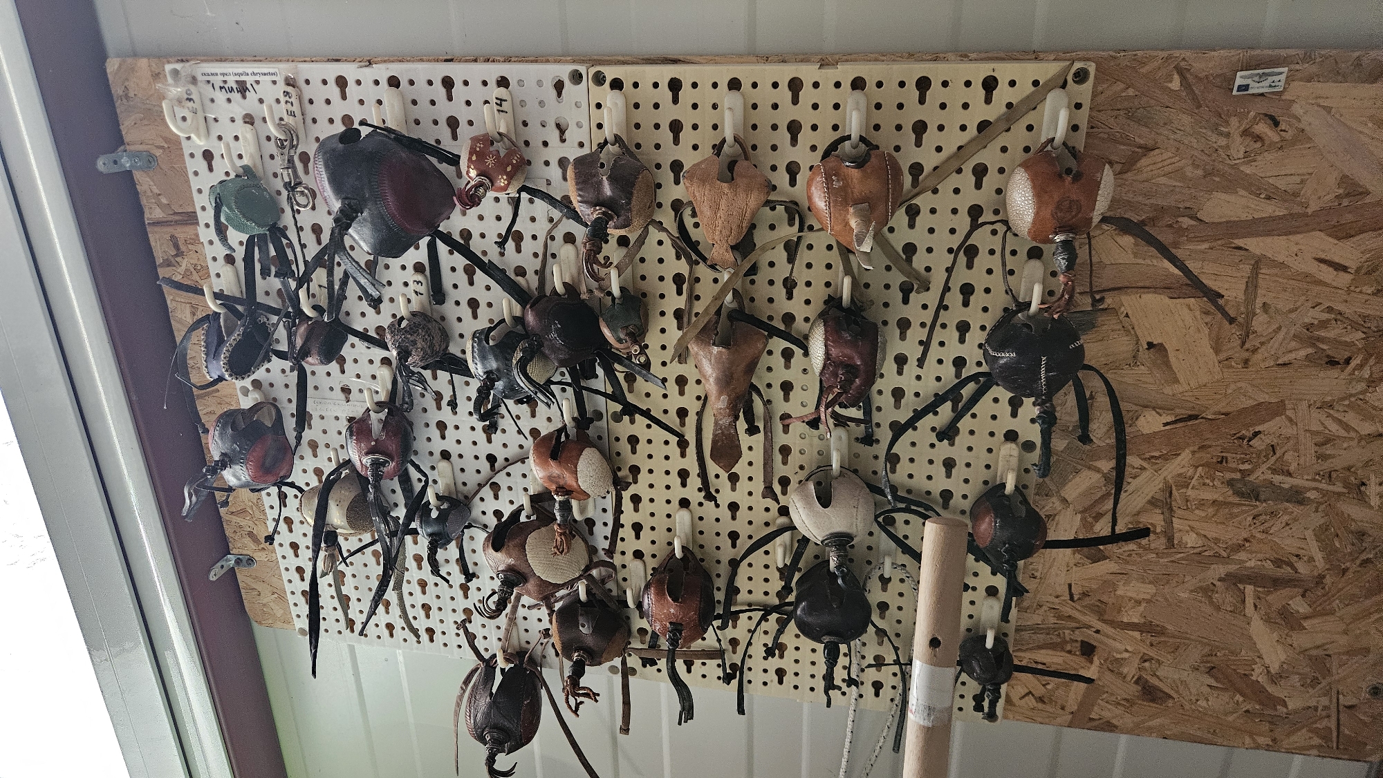 display of handcrafted beetle-shaped ornaments hanging on a perforated board. The ornaments are made of leather or similar materials, with various colors and textures. They are suspended by white plastic hooks. The board is mounted on a plywood panel. A partially visible window frame is on the left side of the image. The image was taken in the city of Stara Zagora, Bulgaria.