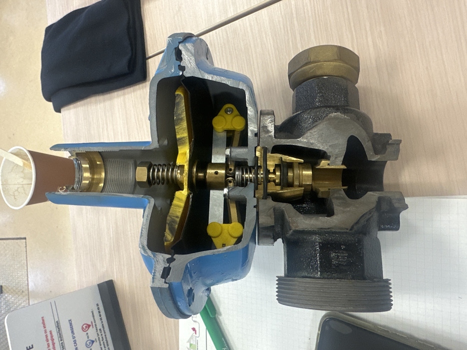 - "An overhead-angle shot depicts a cutaway instructional model of a large mechanical valve or pressure regulator, split vertically to expose its internal components, resting on a light wood-grain table" by FM-sKHBD2, licensed under CC BY 4.0