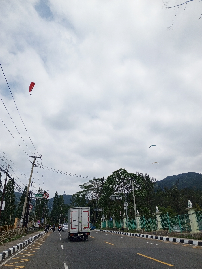 The image depicts a roadside scene in Cisarua, Indonesia, under an overcast sky. Three paragliders are visible: one red paraglider with a single occupant is in the upper left quadrant, while two smaller paragliders, one light blue/green and one yellow/orange, are further in the distance towards the upper right. In the foreground, an asphalt road with a solid white line and a black-and-white striped curb on the left extends away from the viewer. Yellow and white lane markings are present on the road surface. A white box truck, facing away from the camera, occupies the right lane. Several motorcycles and a car are further ahead in the left lane. To the left of the road, multiple utility poles with a dense network of black electrical wires run parallel to the road. Various road signs are mounted on these poles, including a red circular sign with a diagonal line (indicating "No Stopping" or "No Parking") and a green rectangular street sign partially obscured. A wooden fence is situated behind the utility poles. On the right side of the road, a green metal railing supported by white concrete pillars, some topped with decorative finials, forms a barrier or bridge parapet. Beyond this railing, dense green trees and foliage line the landscape, climbing uphill into a mountainous background. In the far distance, a structure resembling a tower or antenna is visible atop a distant peak.