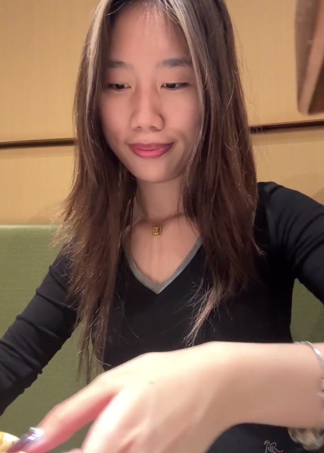 A young woman with long brown hair and blonde streaks poses indoors at a restaurant. She wears a black v-neck long-sleeved shirt, blue jeans, and a gold necklace. She holds chopsticks with a large, flat noodle covered in a reddish sauce over a white bowl also filled with the sauce. She makes a kissing face towards the camera. The background features a beige wall with a black horizontal stripe, a green padded bench, and a blurred television screen.
