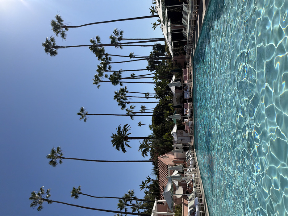A sunny poolside scene features tall palm trees against a clear blue sky