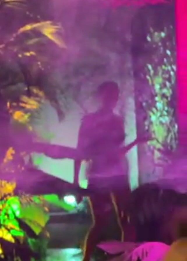 A woman in a floral corset and white shorts walks through a smoky, neon-lit tropical setting. The lighting is a mix of pink, green, and yellow. There are artificial plants and trees around her. She approaches the camera and makes a kissing gesture. There's music playing in the background.