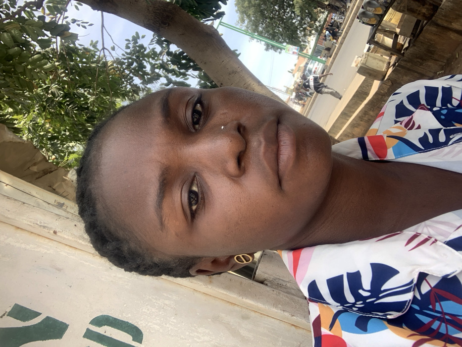 The image captures an individual on a street in Gombe, Nigeria. The subject, a dark-skinned female, is positioned centrally, looking directly forward with a neutral expression. She wears a white collared shirt patterned with multi-colored tropical leaves. A gold-colored, oval-shaped stud earring is present in her left earlobe, and a small, light-colored stud pierces her right nostril. Her hair is braided and pulled back. To the subject's immediate left, a light-colored vertical surface displays partially visible green stenciled lettering, including a clear "G" and part of another letter. To her right, a tree trunk extends upwards, accompanied by green foliage under a clear sky. In the mid-ground and background, a paved street is visible, separated by a concrete curb. Pedestrians are dispersed along the street, with one individual in a black and white striped shirt walking away from the camera. Vehicles and street infrastructure, including poles and possible market stalls, are discernible in the distance. Several containers are situated on the ground adjacent to the curb on the right side of the frame.