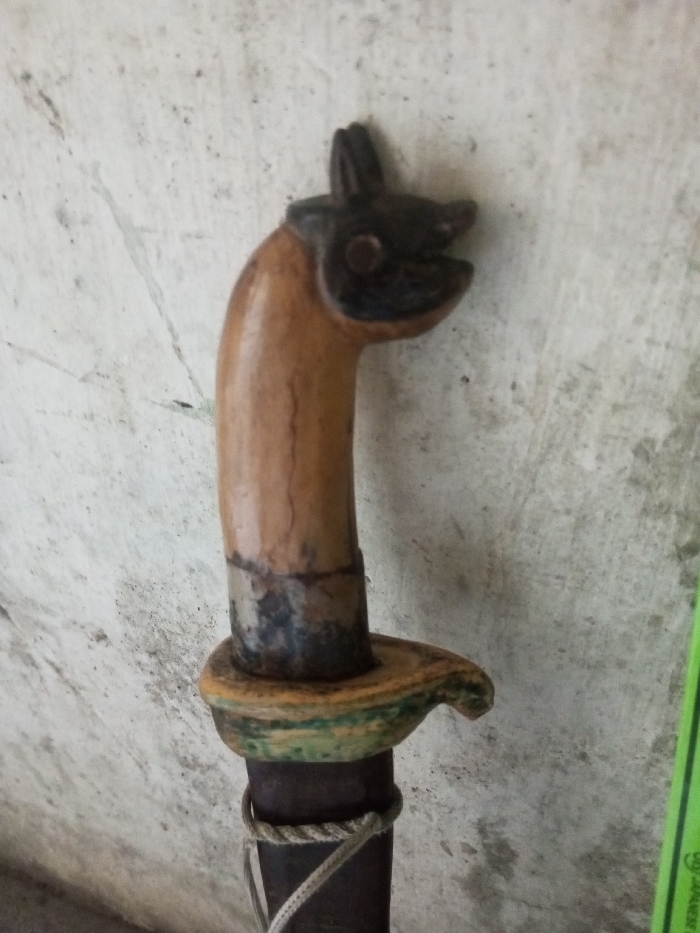 The image displays a detailed view of a knife or dagger, positioned vertically against a light gray, textured wall in Fitsinjovana Bakaro, Madagascar. The object features a light brown wooden handle, roughly cylindrical and curved, culminating in a dark brown, carved pommel resembling an animal's head, complete with defined eyes, ears, and an open mouth. A vertical fissure is apparent on the handle's surface, and dark discoloration is present where the handle transitions to the hilt. The hilt is a flared, organically shaped piece, painted green and yellow. Below the hilt, a dark, cylindrical section, likely part of the scabbard, is visible, secured by a light-colored braided cord tied around it. No human subjects are depicted.
