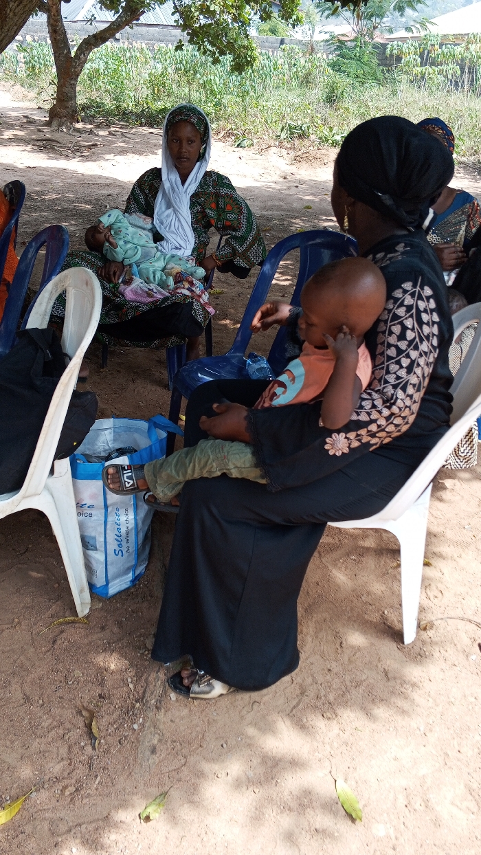 The scene is an outdoor gathering in Ogbono, Nigeria, situated on dry, reddish-brown earth under the partial shade of a tree. In the foreground, a woman in a black abaya with embroidered sleeves and a black hijab sits on a white plastic chair, holding a young child in an orange t-shirt and green trousers on her lap. The child's right hand is near their ear, and one foot, wearing a Fila-branded slide, rests near a blue and white "Sollasite" branded reusable bag on the ground. To her left, in the mid-ground, a woman wearing a patterned green and orange traditional dress and a white hijab sits on a blue plastic chair, cradling an infant swaddled in light blue fabric. A third woman is partially visible in the background-right, seated on another blue plastic chair. The background features dense green foliage and a distant concrete wall. Natural daylight casts shadows on the ground.
