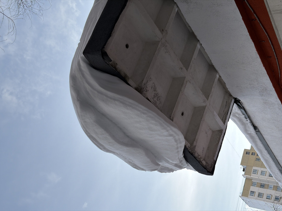 - "A large, dense mass of white snow extends horizontally beyond the edge of a building's flat roof, indicating significant accumulation" by FM-e1BLf2, licensed under CC BY 4.0
