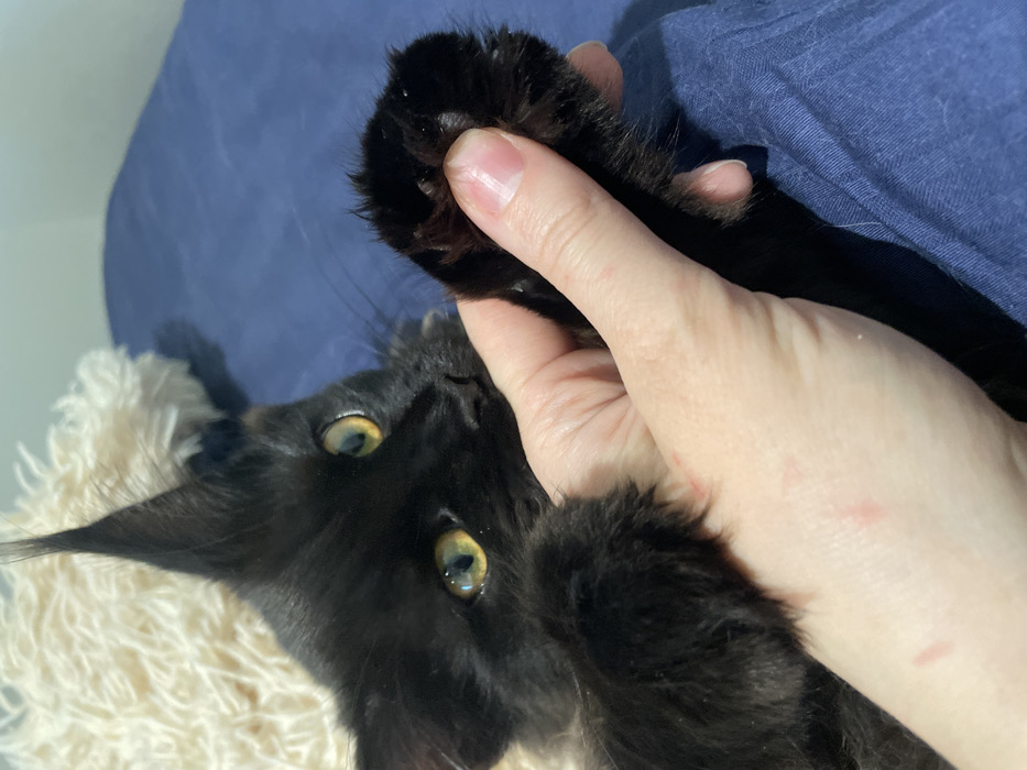A black, long-haired cat with prominent yellow-green eyes and ear tufts is depicted in a close-up indoor scene. The cat's head is angled towards the viewer, and its right front paw is being held by a human's fair-skinned right hand. The human's thumb is pressed against the cat's paw pad, while fingers secure the paw. Several faint, reddish marks, consistent with minor scratches, are visible on the dorsum of the human hand. The cat's left front paw is partially visible near the human hand. In the background, a cream-colored, heavily textured fluffy fabric is partially visible behind the cat's head, and a dark blue, smooth fabric surface extends across the lower right and background. The scene's specific location within the city of Unknown, Unknown, is not discernible.