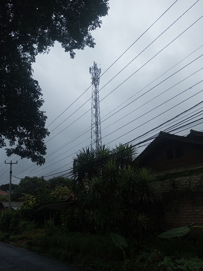 A tall cell tower rises against a cloudy sky, interspersed with numerous power lines. A large tree branch obscures the upper left corner. Below the power lines, lush greenery and a few buildings are visible. A house with a dark roof and wooden walls stands to the right, partially obscured by vegetation. The foreground features a dark, paved road, bordering more dense green foliage. Overall, the scene depicts a cloudy, overcast day within a somewhat developed area.