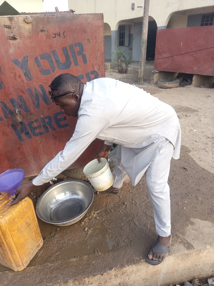 A man in a light-colored outfit turns a water tap on a rusty red water tank with the words "YOUR CLEAN WATER HERE." He holds a bucket and attempts to fill it with water, with an aluminum bowl and a yellow container nearby. The ground appears muddy. A building with an arched entrance is visible in the background.