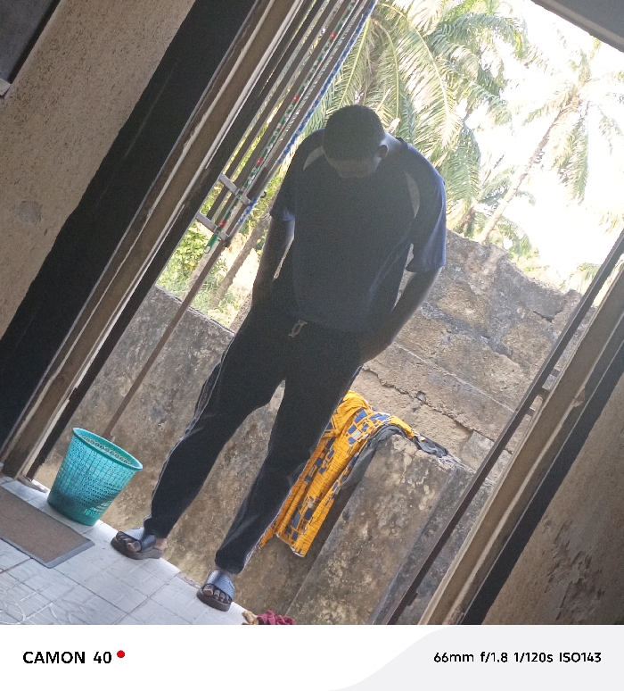 A man stands in a doorway, looking down with his hands in his pockets. He wears a blue shirt and dark pants with sandals. Outside the doorway, palm trees are visible. A blue trash can is to the left, while a yellow and black cloth lies to the right on some stairs. The doorway is angled with an open entranceway and bars above.