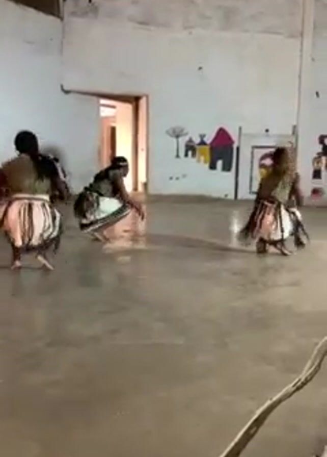 Several people are dancing in a large room. The dancers, dressed in matching skirts and headdresses, are performing a coordinated routine. They move energetically, bending low and raising their arms. The room has a concrete floor and white walls. There's a drawing of houses and a tree on one wall. The roof appears to be made of corrugated metal. The overall impression is of a traditional performance in a simple, indoor space.