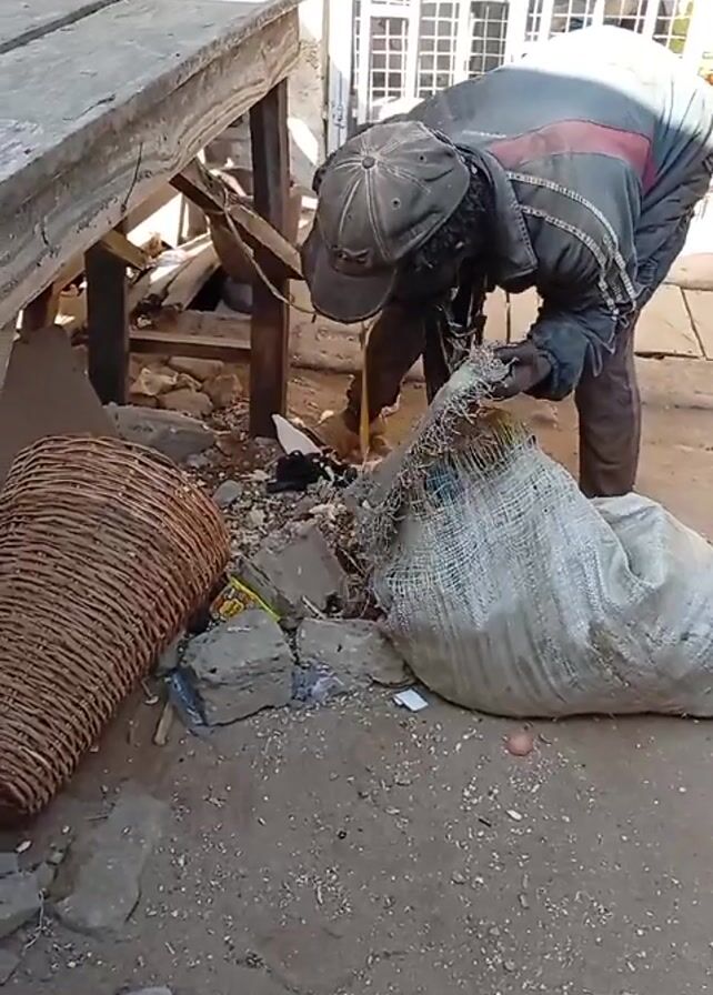 A person wearing a cap, a jacket, and gloves is bent over and picking up trash with a long stick. They are placing the trash into a large, woven sack that is lying on the ground. There is a large wicker basket next to the sack and the person. The ground appears to be dirt and gravel. A wooden table is nearby, as well as part of a white barred window.