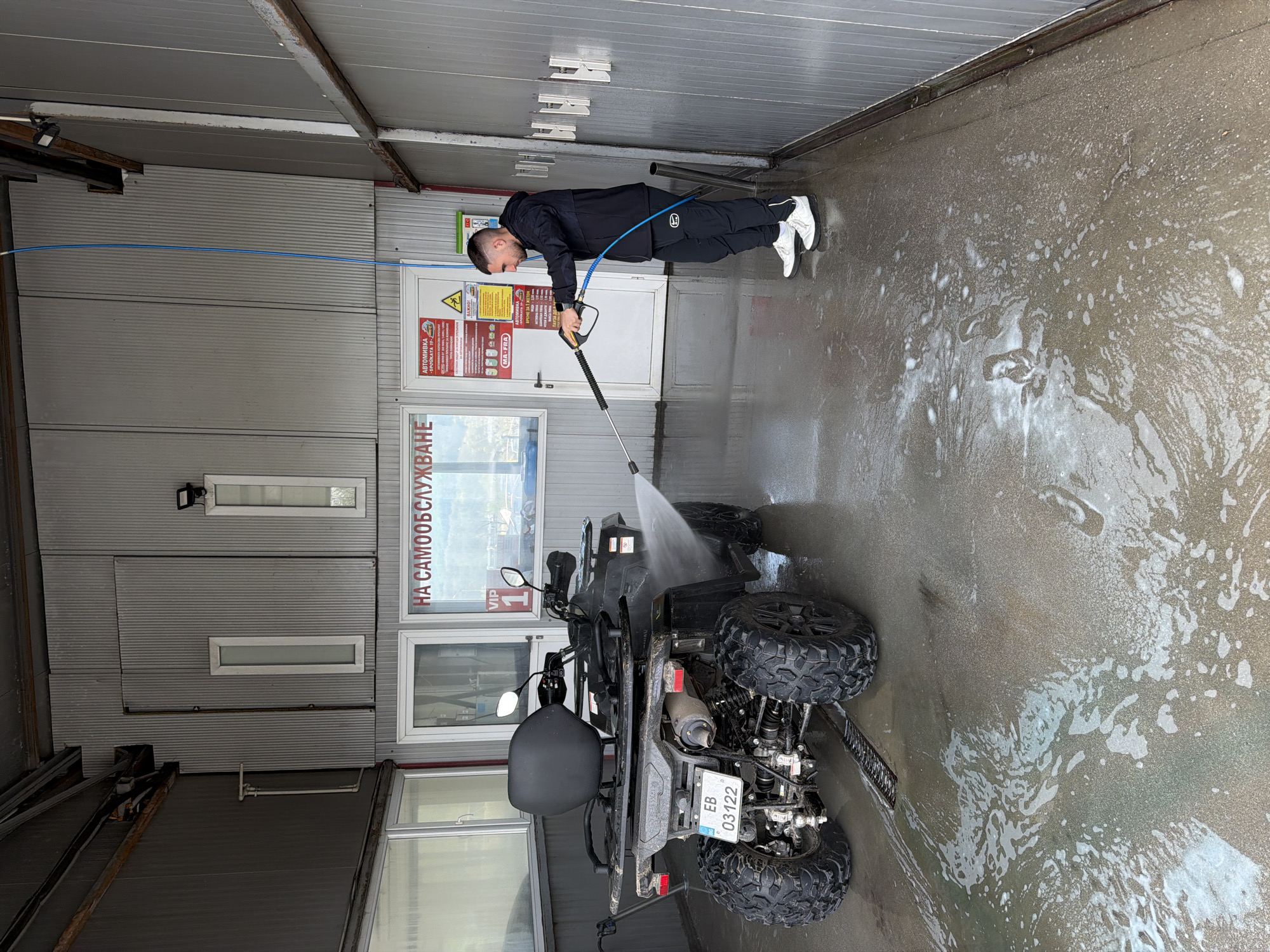 A man in a black tracksuit and white sneakers is washing a black quad bike with a pressure washer at a self-service car wash. The car wash facility has gray corrugated metal walls. The quad bike has a license plate with the code "EB 03122". Text in Bulgarian on a sign above a window reads "НА САМООБСЛУЖВАНЕ". The car wash appears to be located in the city of Gabrovo, Bulgaria. The floor is wet and soapy.