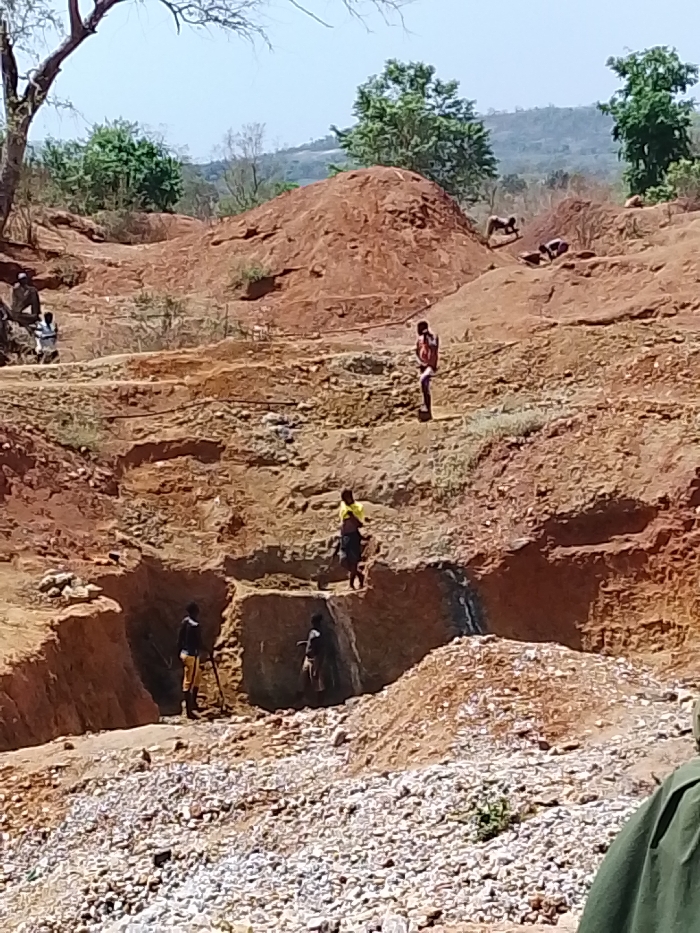 In a barren, hilly landscape marked by red soil, several individuals are engaged in what appears to be mining activities