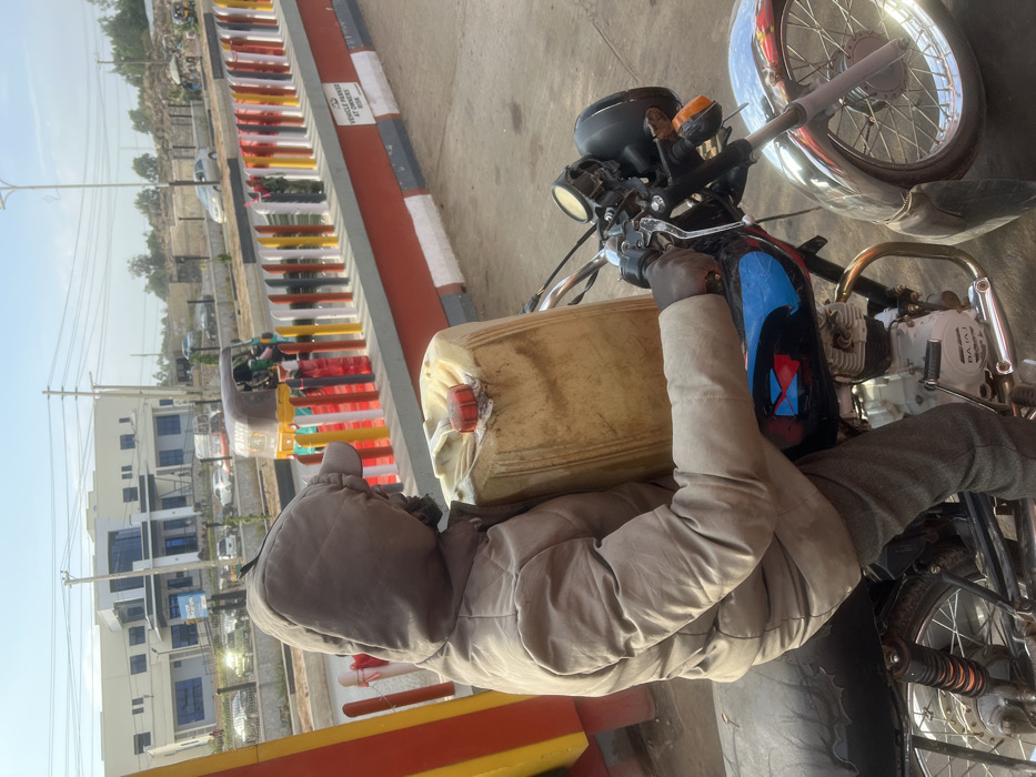 A man in a tan jacket and gray pants sits astride a motorcycle, a large beige container resting on his lap. The motorcycle is black and chrome with a blue design on the tank. The scene is set at what appears to be a gas station or roadside area, with colorful barriers visible in the background. Buildings and other vehicles are also present. The image is captured in daylight with a clear sky.
