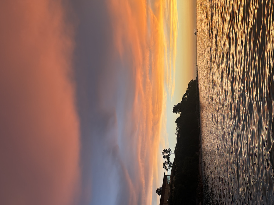 The image presents a coastal scene at sunrise or sunset in Ban Ko Li Pe, Thailand. The sky, occupying the upper two-thirds of the frame, displays a broad spectrum of colors, transitioning from deep orange and red near the horizon to pinks and muted purples, with patches of blue visible higher up. Layered stratocumulus clouds are prominent, reflecting these hues. The lower third of the image depicts a body of water, likely the sea, its surface marked by numerous small ripples that reflect the golden-orange light from the sky. On the left, a dark, elevated landmass covered with dense foliage and several silhouetted trees extends into the water. A multi-story building with a distinct roofline is partially visible in silhouette on the upper portion of this landmass. In the distance, on the water to the right, a single vessel is discernible as a dark silhouette. No individuals are identifiable within the scene.