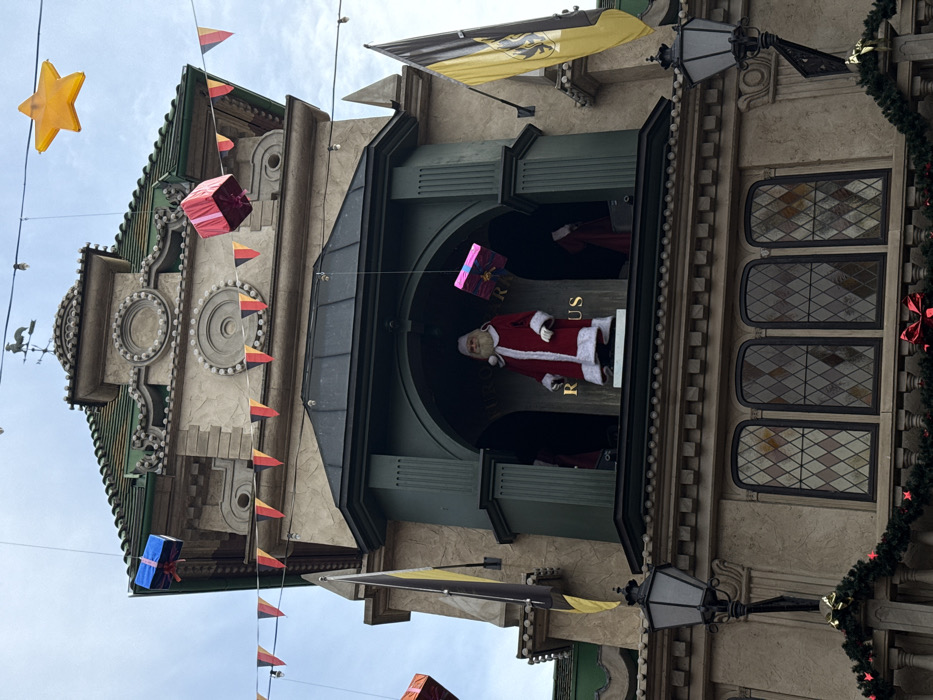 This image depicts a multi-story themed building within Europa-Park in Rust, Germany, under an overcast sky. The upper facade features ornate stone-like detailing, a green-tiled roof, and a rooster weather vane. A string of black, red, and yellow triangular bunting is strung horizontally across the upper frame. In the central open archway on the building's mid-section, a large animatronic Santa Claus, dressed in a red suit with white trim, stands on a white platform. Two smaller, partially visible figures in red attire flank Santa within the same recess. The word "RUST" is displayed in gold lettering on the back wall of this recess. Two yellow and black flags, each bearing a black crest, are mounted on the building's facade, one on each side of the archway. Overhead, a blue gift box, a pink gift box, and a yellow star ornament are suspended by wires. The lower building section features three arched windows with diamond-patterned panes. A decorative railing below these windows is adorned with green garland, red bows, and small red star ornaments. An ornate black street lamp, also decorated with garland and a gold bow, is affixed to the left side of the lower facade.