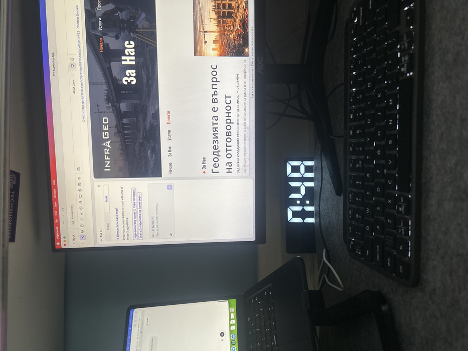 The scene depicts an indoor desktop computer workstation, located in Voluyak, Bulgaria. The central object is an AOC brand monitor displaying a webpage with "INFRAGEO" branding and Bulgarian text, including "За Нас" (About Us) and "Геодезията е въпрос на отговорност" (Geodesy is a matter of responsibility). The webpage background image features an elevated highway under construction, with a surveying total station on a tripod visible on the right. A section labeled "Ask AI" from the "HighLevel" platform is also visible on the left side of this monitor. To the left, a dark-colored laptop rests on a black stand, displaying a predominantly white screen. Directly in front of the main monitor, a black digital clock with white LED digits displays "0:48". A black keyboard with white backlighting is positioned on a grey, textured desk surface in the foreground. White cables are visible on the desk. The background consists of a light blue wall, with a darker horizontal strip at the top featuring inverted white text, partially readable as "TECHSHOP BG". No individuals are present in the image.