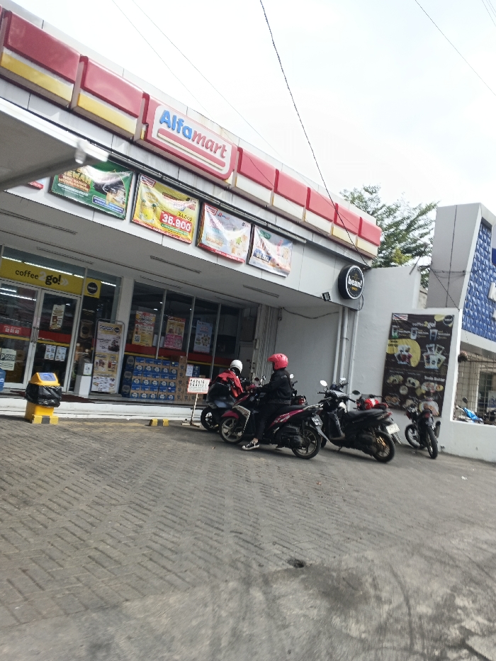An exterior view depicts the entrance to an Alfamart convenience store in Margahayu, Indonesia, under an overcast sky