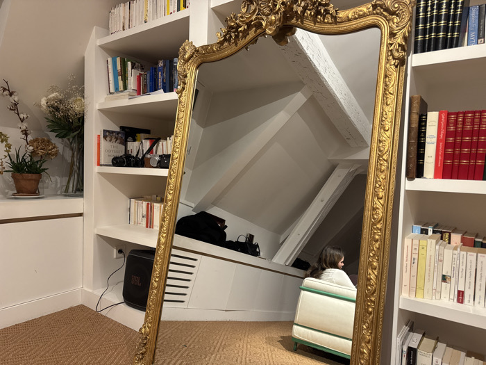 A gold-framed mirror stands in a room. The mirror reflects an attic space with a white armchair and a person seated within. A white bookcase is partially visible behind the mirror, filled with books. To the left, a plant and flowers sit on a surface next to the bookcase. A black JBL speaker is on the floor near the bookcase. The floor is covered with a woven rug.