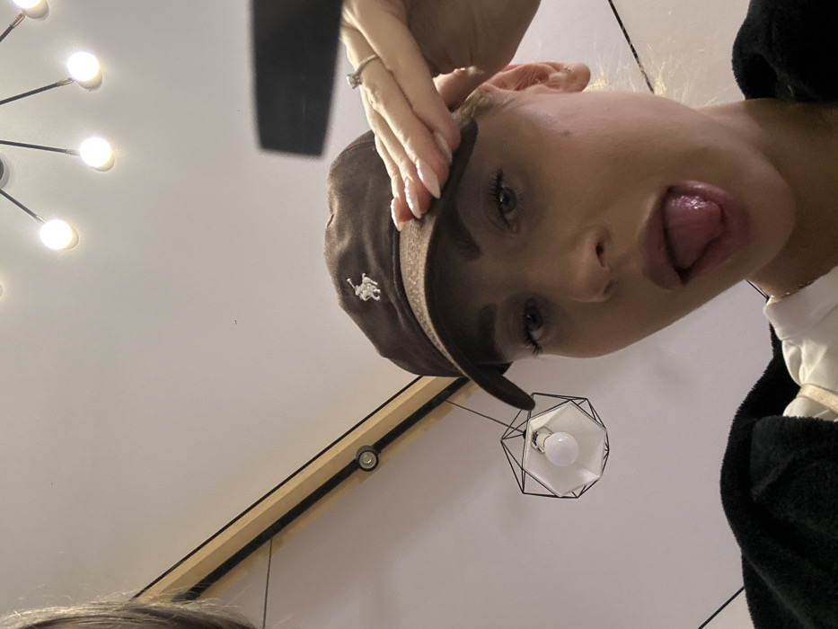 A woman with light skin and blue eyes sticks out her tongue at the camera while wearing a brown Ralph Lauren baseball cap. She has manicured nails with light pink polish on her left hand, and a ring on her left ring finger. She wears a white top under a black hooded robe. A modern ceiling light fixture is behind her baseball cap and part of a second woman's head is visible at the bottom.