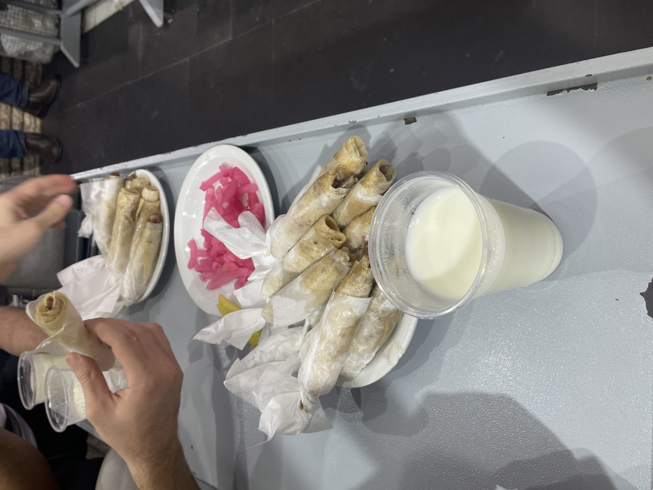In Sarouja Municipality, Syria, a light gray table is depicted with a meal in progress. The scene features multiple small, rolled food items, consistent with shawarma wraps, each partially encased in white paper. Two white ceramic plates hold these wraps; one plate in the foreground contains approximately ten wraps, while a smaller stack of about six wraps is visible on a plate further back. Adjacent to the foreground wraps, a white ceramic plate holds a mound of bright pink, sliced pickled vegetables. Three clear plastic cups are present, each filled with a white, opaque liquid, likely Ayran or a similar yogurt drink. One cup is prominent in the immediate foreground, another is positioned next to the first plate of wraps, and a third is partially visible further back. A human left arm and hand are visible holding one of the paper-wrapped shawarma rolls near the center-left. Another human right hand is visible reaching towards the plate of wraps in the background. The environment includes a dark floor and the lower extremities (legs and feet) of two individuals in dark footwear, standing or seated in the background.