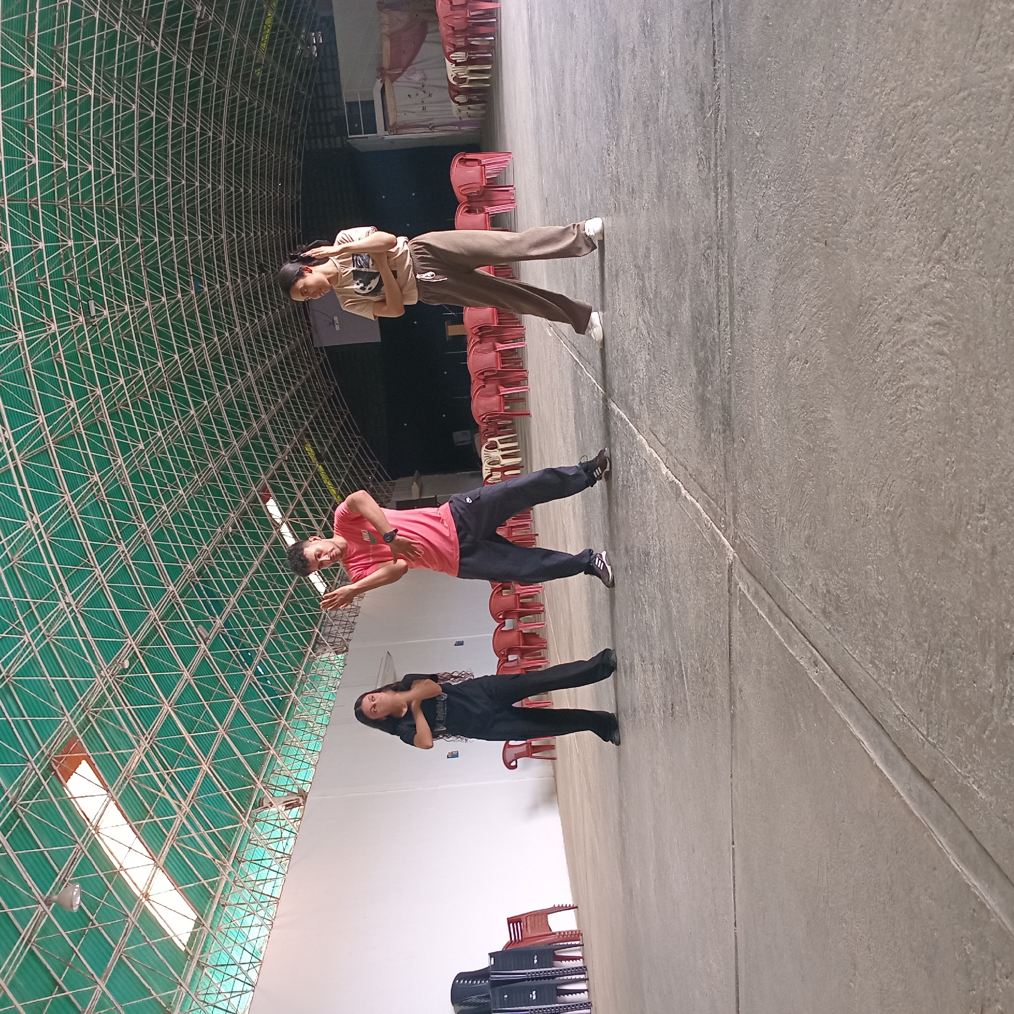 The image depicts three individuals in what appears to be a large indoor space, possibly a gymnasium or warehouse. The location is identified as Duaca, Venezuela. The space has a high ceiling with a complex lattice structure, partially illuminated by rectangular light fixtures. The floor is concrete, marked by linear divisions. Rows of red plastic chairs are visible along the wall, with some stacks of black chairs. The three individuals are positioned in a line across the frame. The person closest to the viewer is wearing black clothing and has long hair. The person in the middle wears a red shirt and dark pants. The person furthest away is wearing a tan shirt and brown pants. All three appear to be posing for the photograph. Their actions do not suggest any specific interaction beyond the photo.