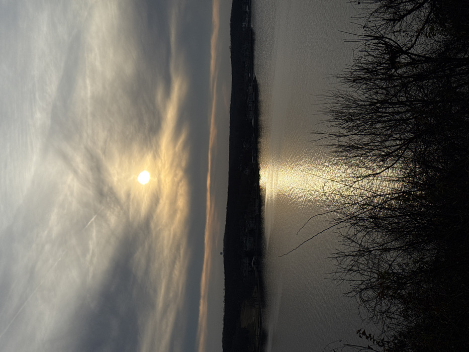 A sunset view features a body of water reflecting golden light. A thin strip of land is visible, possibly a distant shore or island. Silhouetted tree branches occupy the right edge. Above, the sky displays varied cloud formations with a bright sun. The picture is rotated.