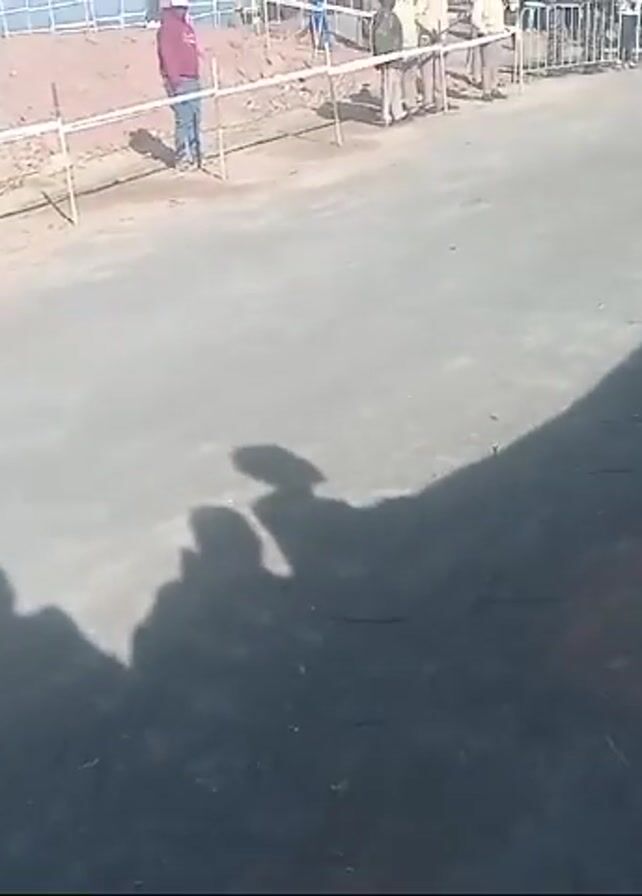 group of runners participating in a race. The camera, positioned near the starting line, captures the runners as they begin to sprint down a paved road. A crowd of spectators lines the course behind a barrier. Many of the runners are wearing bibs with numbers on them. Some are wearing blue shirts, while others are wearing black. The sky is clear and blue, suggesting a sunny day. There are several people visible wearing reflective safety vests and helping to oversee the event. In the background, a white tent structure is set up on a small hill, along with a white fence. The overall scene suggests a large, organized running event with many participants and spectators.
