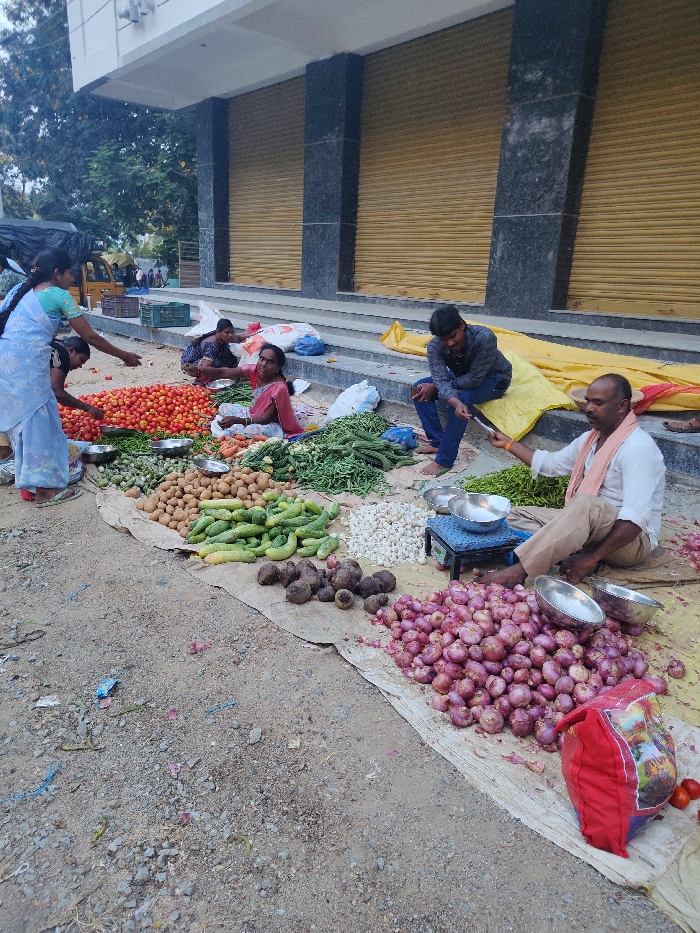 - "This image depicts an outdoor vegetable market in Brahmanapalle, India, situated on a dirt ground alongside the concrete steps of a multi-story building" by FM-qs9KA3, licensed under CC BY 4.0