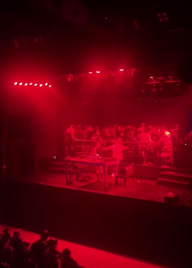 A nightclub stage is bathed in red light, later illuminated with yellow beams