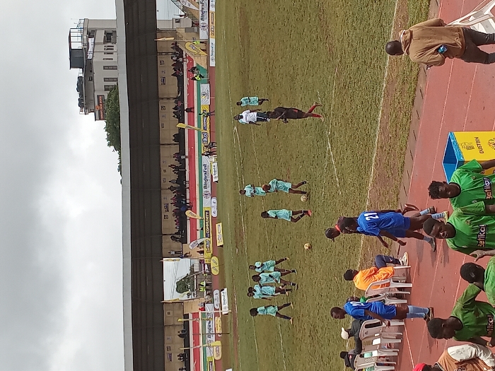 The image displays an outdoor football stadium under an overcast sky, specifically Kinoru Stadium in Meru, Kenya, identifiable by the "COMMUNITY HOTEL" building visible behind the main spectator stands