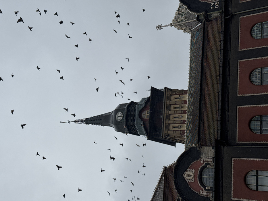 The image depicts the Subotica City Hall in Subotica, Serbia, under an overcast, light grey sky. The dominant feature is the building's central clock tower, which rises vertically from the mid-ground. The tower possesses a dark, pointed spire topped with an ornate metallic finial. Below the spire, a circular clock face with Roman numerals is visible, indicating a time of approximately 10:15. The tower's mid-section exhibits Hungarian Secessionist architectural details, including reddish-brown and beige patterned stonework, rectangular pilasters, and arched window openings. In the lower portion of the frame, sections of the City Hall's roofline and upper facade are visible. The roof features a complex pattern of colored tiles. Ornate gable ends, characterized by dark red surfaces with intricate white decorative trim, frame arched windows. A decorative finial adorns a smaller roof section on the right. A partial inscription, "1908," is visible on the right side of the building's facade. Numerous dark-plumaged birds, estimated to be fifty or more, are captured in various stages of flight across the sky, predominantly above and around the clock tower. There are no human subjects visible. The overall lighting suggests an overcast daytime condition.