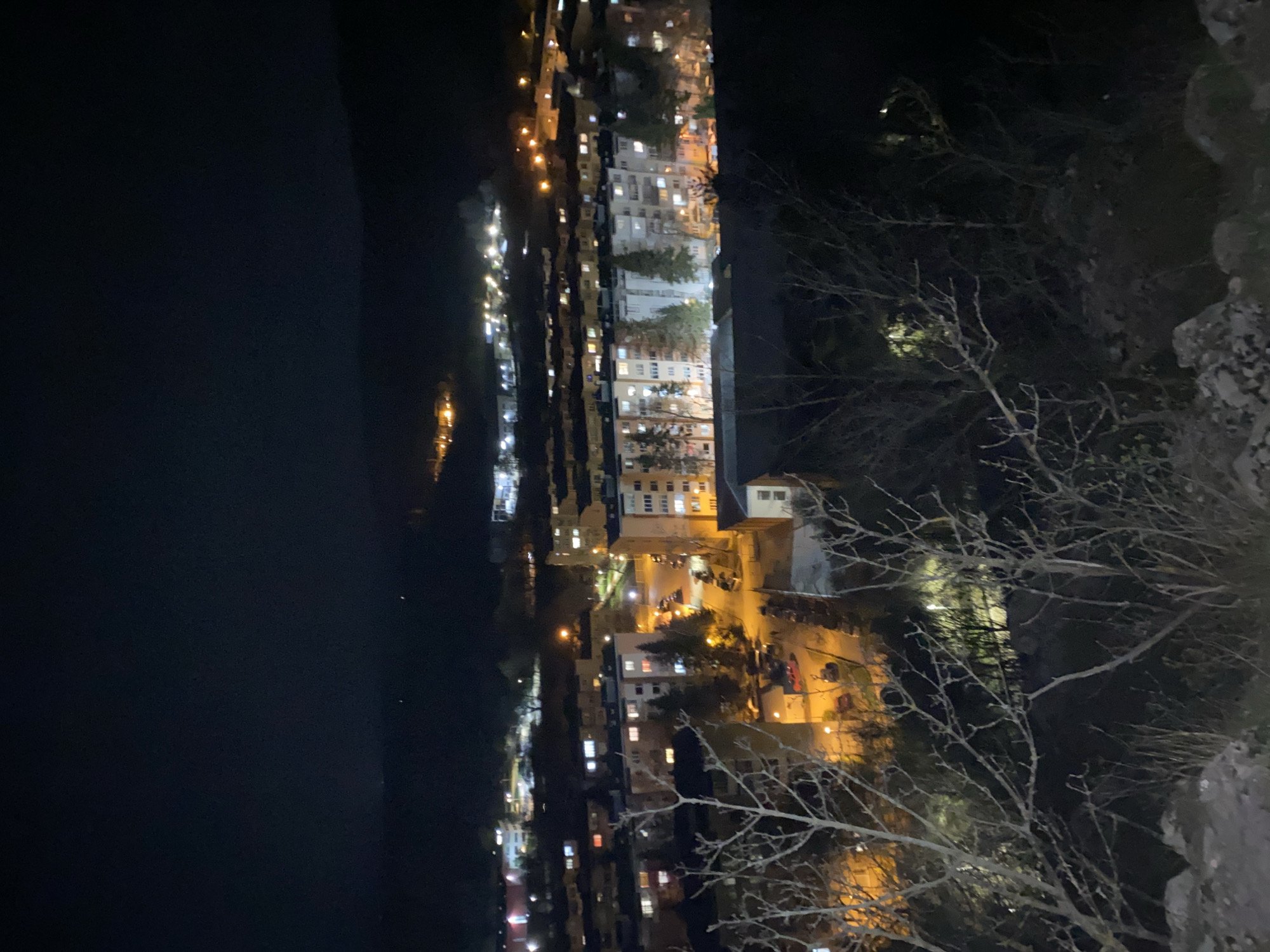 An aerial view at night of the city of Veliko Tarnovo, Bulgaria shows buildings, lights, trees, and a body of water. The body of water is to the left and is mostly dark with some reflected light. To the right of the water is a line of buildings with many windows lit up. There is a street with several cars parked on it. Trees are interspersed in between the buildings. In the foreground, to the right, are bare trees and stone.