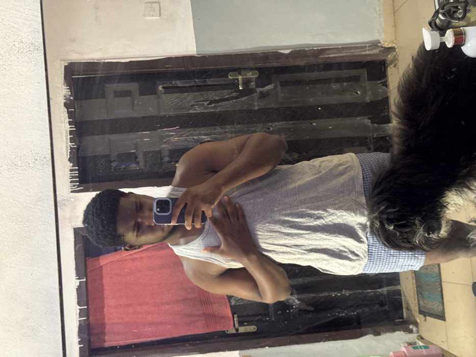 An adult male is observed taking a mirror selfie in an interior room in Asipa, Nigeria. The male, with dark skin and short dark curly hair, wears a light grey tank top and blue and white checkered boxer shorts. He holds a dark-cased smartphone in his right hand, with his left hand placed on his chest. A small dog with long, dark, shaggy fur and a lighter snout stands on the floor in front of him. The mirror reflects two dark-colored panel doors behind the male; a red towel hangs on the left door. White paint drips are visible along the top of both door frames. The walls are light-colored. A white light switch plate with two switches is present on the right wall in the reflection. On a surface to the lower left, several bottles, including a pink container and a white pump dispenser bottle, are visible. A small mat is visible on the floor near the left door. The room's overall appearance suggests a lived-in private residence.
