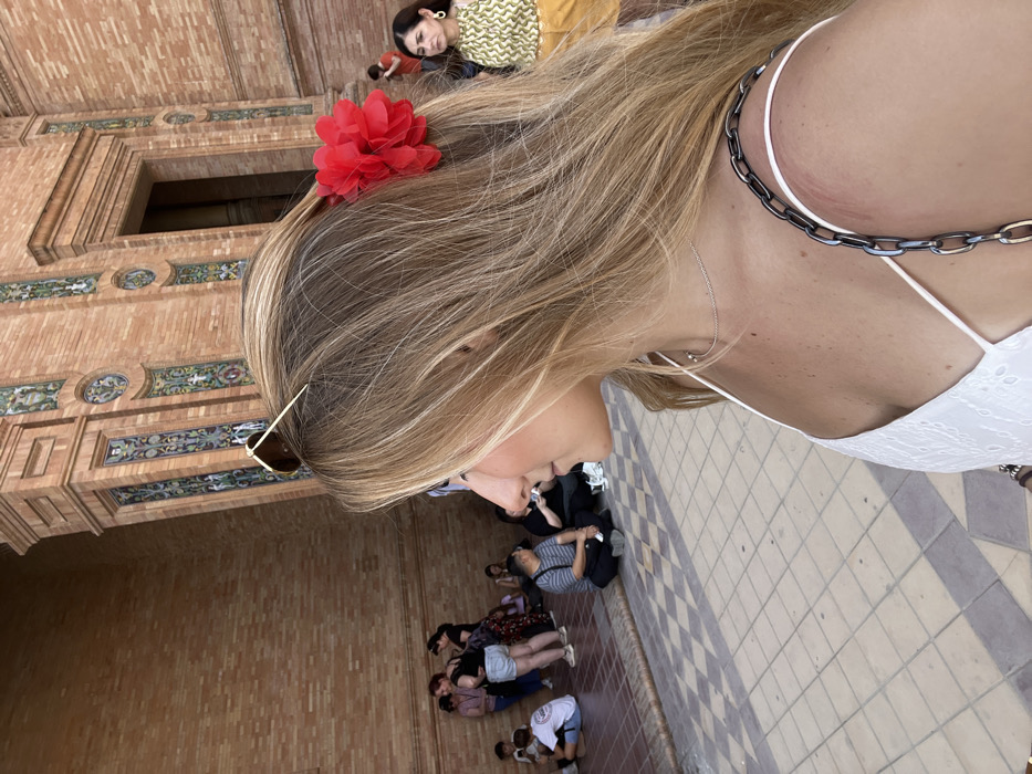 The image primarily features a young woman in the foreground, seen from the right side, with her left profile turned towards the left. She has long, wavy blonde hair, with dark sunglasses resting on top of her head and a bright red fabric flower positioned behind her right ear. She is wearing a white, thin-strapped sleeveless top with eyelet embroidery and a thin silver chain necklace. A dark, possibly metallic, chain-link strap from a bag is visible over her right shoulder, with a distinct red abrasion mark on her skin underneath the strap. The background reveals the Plaza de España in Seville, Spain. A large, ornate brick building, characteristic of the location, features pillars, arched entrances, and extensive decorative ceramic tiling in patterns of green, blue, and yellow. The ground is paved with light-colored square tiles, interspersed with darker, patterned sections. Several individuals are present in the mid-ground and background. To the left, a group of people are either standing or seated on the tiled ground near the base of the building. One person wears light blue shorts and a black top. Further right, an individual in a striped shirt is seated on the ground. Towards the far right, a woman with dark hair, wearing a green and white patterned halter top and a yellow skirt, is visible, looking to her right. A faint figure in a red shirt is also discernible further back. The scene is illuminated by natural daylight.