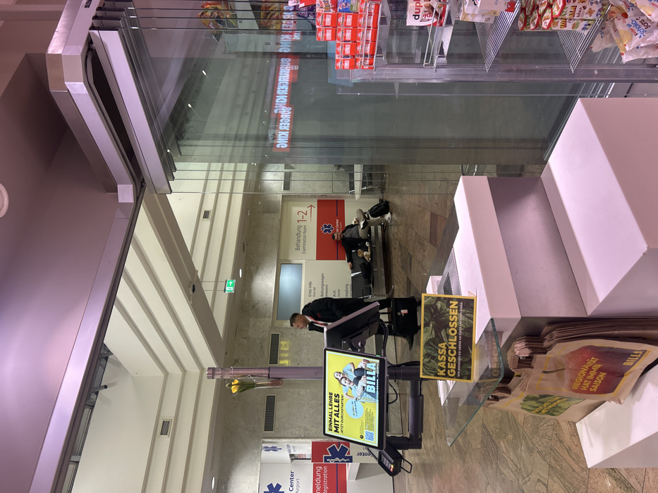 The image depicts an indoor public area, identified as being within Vienna International Airport in Schwechat, Austria. The scene captures elements of a medical facility waiting area, retail space, and food service establishment. In the foreground, a white, tiered retail display stand occupies the lower left. A yellow sign with green text reading "KASSA GESCHLOSSEN" (Cashier Closed) rests on a clear glass shelf atop the stand. Below, several brown paper bags branded "BILLA" with the text "REGIONALITÄT HAT IMMER SAISON" are displayed. Adjacent to this stand, a black digital advertising kiosk shows a "BILLA" advertisement featuring two women and the German text "EINMAL LEHRE MIT ALLES JETZT DURCHSTARTEN." A black payment terminal is attached to the left side of this kiosk. In the midground, a male individual is walking from right to left, wearing a dark jacket, light shirt, and dark tie, pulling a black rolling suitcase. Behind him, a tall, light-colored pole holds a clear cylindrical vase containing three yellow flowers. Behind the pole, a white wall displays signage for a medical center, including "Erste Hilfe" (First Aid), "Rettungswagen" (Ambulance), "Arzt" (Doctor), "Behandlung Examination Room 1-2" with an arrow, and "Medical Center Airport," all accompanied by red cross symbols. A green exit sign with a white arrow is mounted high on the wall. To the right of the medical center entrance, a second male individual is seated on a grey public bench. He has dark hair and a beard, wears a dark jacket, holds a white cup, and is looking towards the camera. A small brown teddy bear sits next to him on the bench, and a black backpack rests on the floor beside the bench. On the far right, a transparent glass partition separates the foreground area from an adjacent commercial space. The glass reflects inverted red lettering that spells "BURGER KING." Through the glass, a metal shelving unit is visible, stocked with various packaged snack items, including red-wrapped products and items branded "duplo." The ceiling above features white panels with linear indentations and integrated lighting, and the floor is composed of large, light-toned tiles.