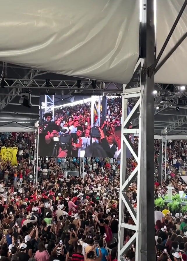 An overhead, angled shot captures a large crowd gathered in an indoor space. The crowd, largely composed of young people, are looking towards a large LED screen which shows a group of men posing for photos. Many people in the crowd are holding up cell phones, presumably to record or take pictures of the screen. The scene is well-lit, with an open structure above covered by white fabric. There are support structures in the frame made of metal.