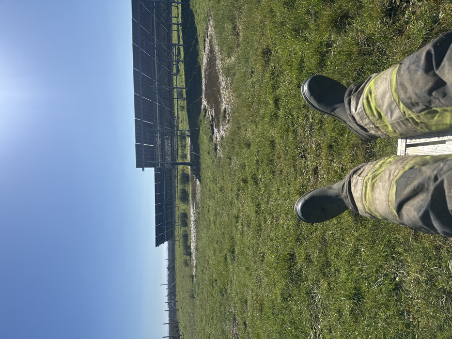 A first-person perspective image depicts the lower extremities of an individual within the Millbrook Solar Farm in Southampton, United Kingdom