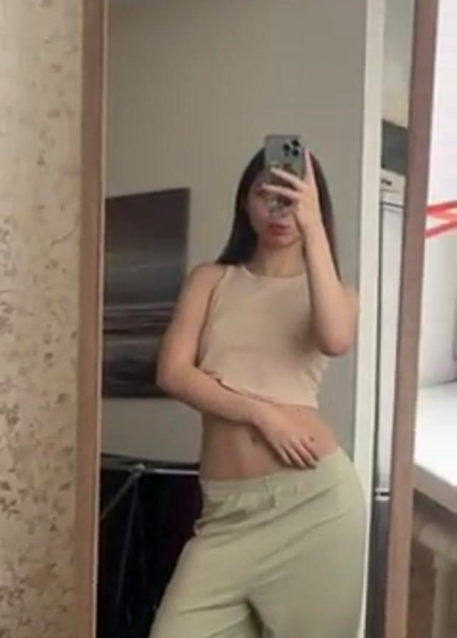 A woman in a mirror selfie holds a cell phone up to the mirror and takes a video of herself. She is wearing a nude tank top and light green, loose-fitting pants. The mirror is tall and narrow with a wooden frame. She takes the photo in what appears to be a kitchen, as a refrigerator can be seen in the background. The woman turns to the side to show off her body. There is music playing in the background.