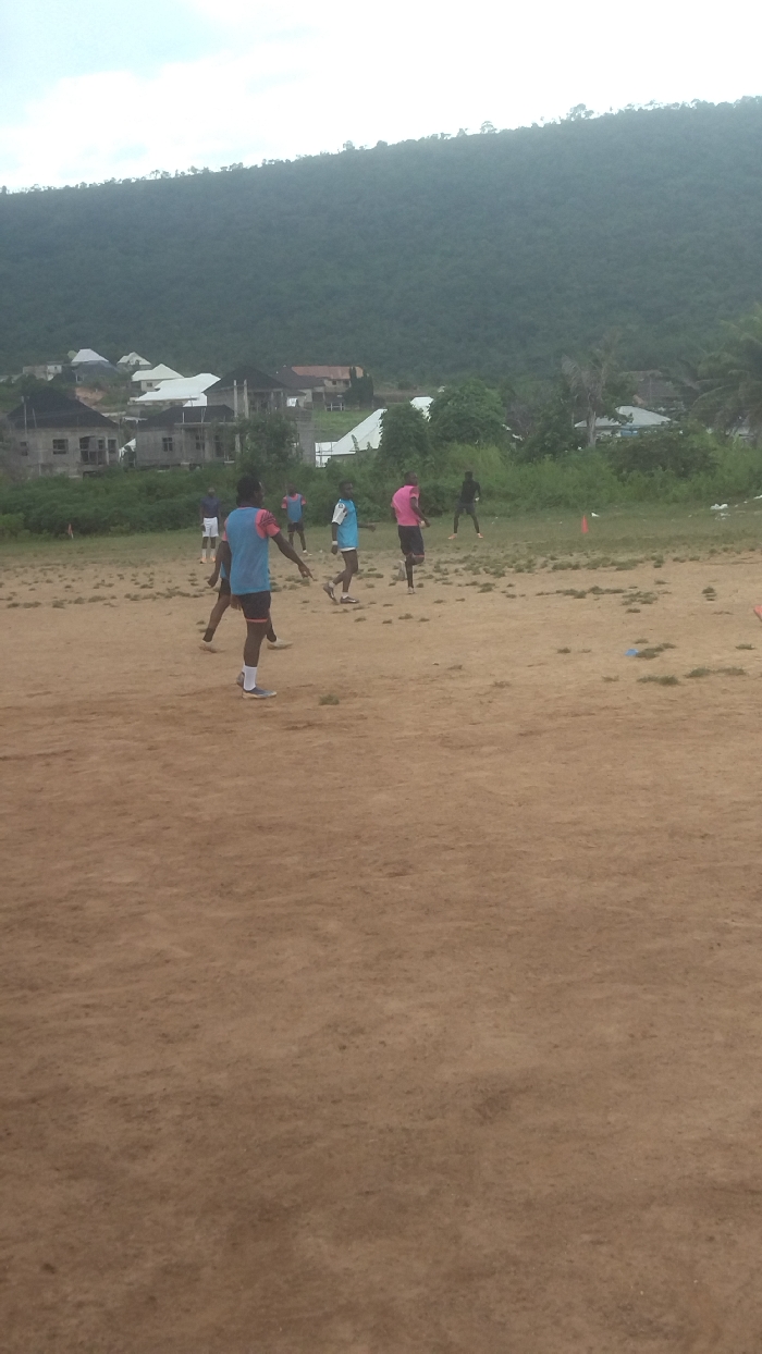 The image depicts an outdoor sports activity taking place on a reddish-brown dirt field in Lokoja, Nigeria