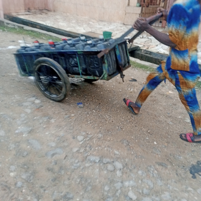 - "A single individual pushes a heavily laden two-wheeled handcart forward on an unpaved, gravel road in a residential area of Lagos, Nigeria" by FM-qjhjS2, licensed under CC BY 4.0