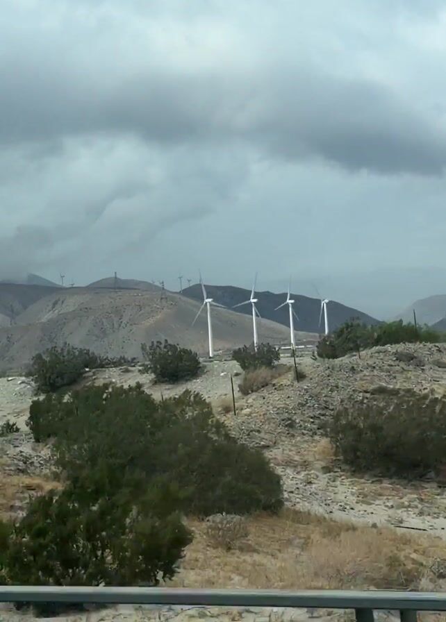 landscape with several wind turbines on hills in the distance under a partly cloudy sky. The foreground includes desert vegetation and a gray metal guardrail. The video is taken from a moving vehicle on a paved road.