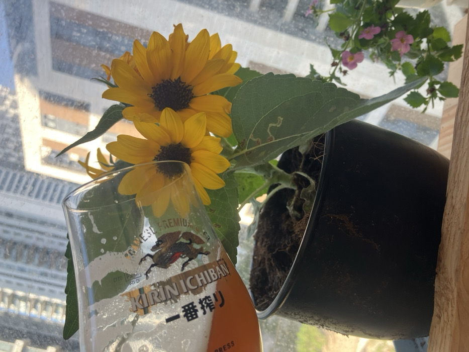A clear glass labeled "KIRIN ICHIBAN," containing an amber liquid and white foam, is tilted, actively pouring its contents onto the dark soil of a potted sunflower plant