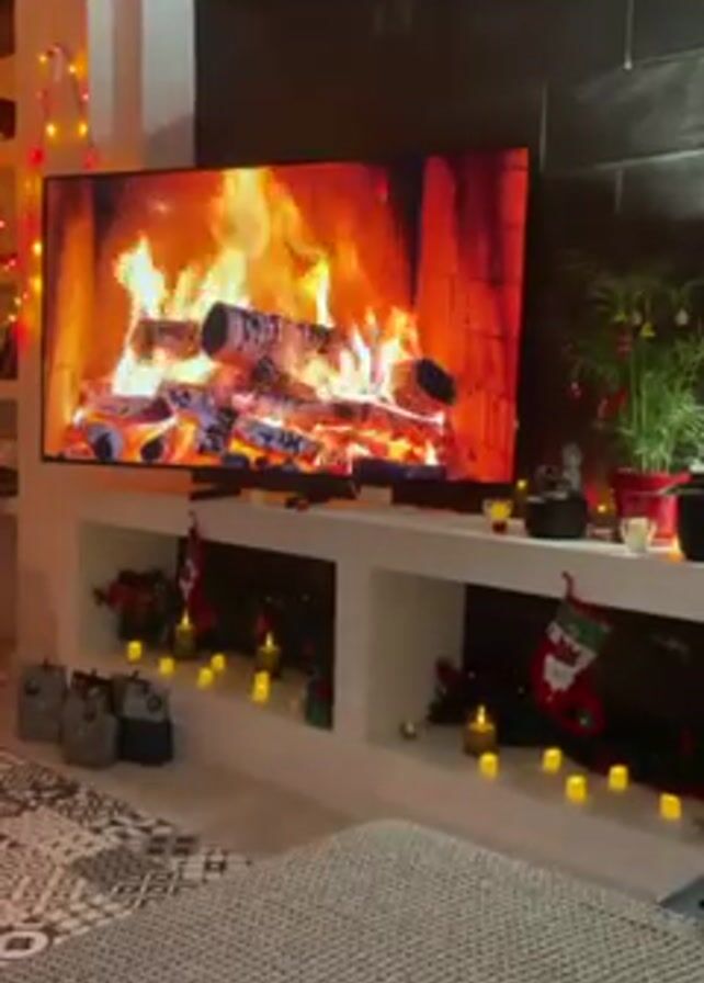 living room decorated for Christmas. In the center of the shot is a large flat-screen television displaying a roaring fireplace. The TV sits atop a white built-in shelf unit that is decorated with small candles and Christmas-themed items like stockings and garlands. To the left, there are several small gift bags. The floor is covered with a patterned rug and a gray blanket. The room is dimly lit, creating a warm and cozy atmosphere.