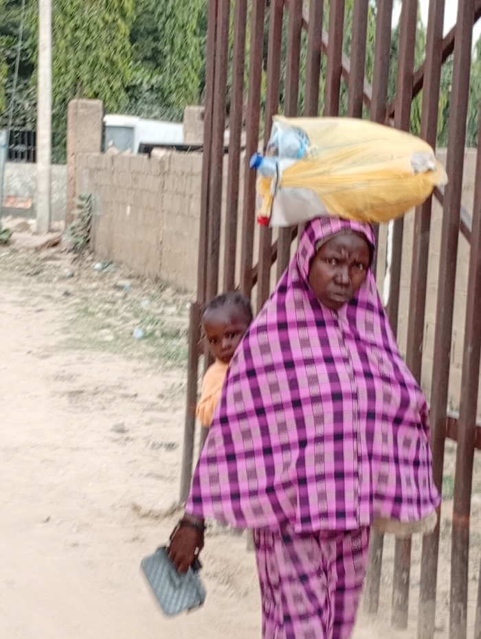 A woman in a pink and black checkered outfit balances a large yellow bag on her head. She holds a blue wallet in her hand and stands near a brown metal gate. Behind her, a small child in an orange shirt peers out, partially obscured by the woman. The scene is set outdoors with a sandy ground and a wall with a white vehicle in the background.