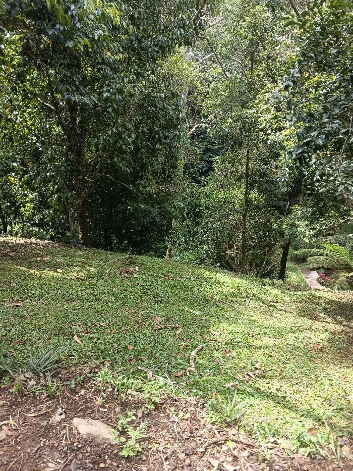 This image displays a natural outdoor scene within the city of Munyati, Zimbabwe. The foreground consists of exposed brown earth mixed with small rocks and sparse green vegetation, including a distinctive spiky plant on the left. A gently sloping, manicured green grass field occupies the midground, marked by irregular patches of sunlight and shadow, and scattered dry leaves and small branches. The background is densely vegetated with numerous mature trees and undergrowth, presenting a thick canopy of varied green foliage. Towards the lower right, a light-colored, winding paved path descends into a cultivated area featuring manicured green hedges and hints of red ground cover or flowers. The scene is brightly illuminated by natural sunlight, casting discernible shadows. No individuals, animals, or active events are present in the frame.