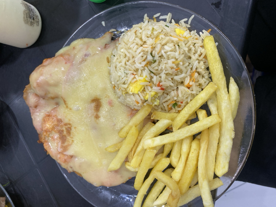 A plate of food sits on a dark surface. It features a portion of fried rice molded into a dome shape, alongside a serving of golden French fries. A piece of meat is covered in melted cheese. A white sauce container is visible in the background. The plate appears to be clear glass or plastic.